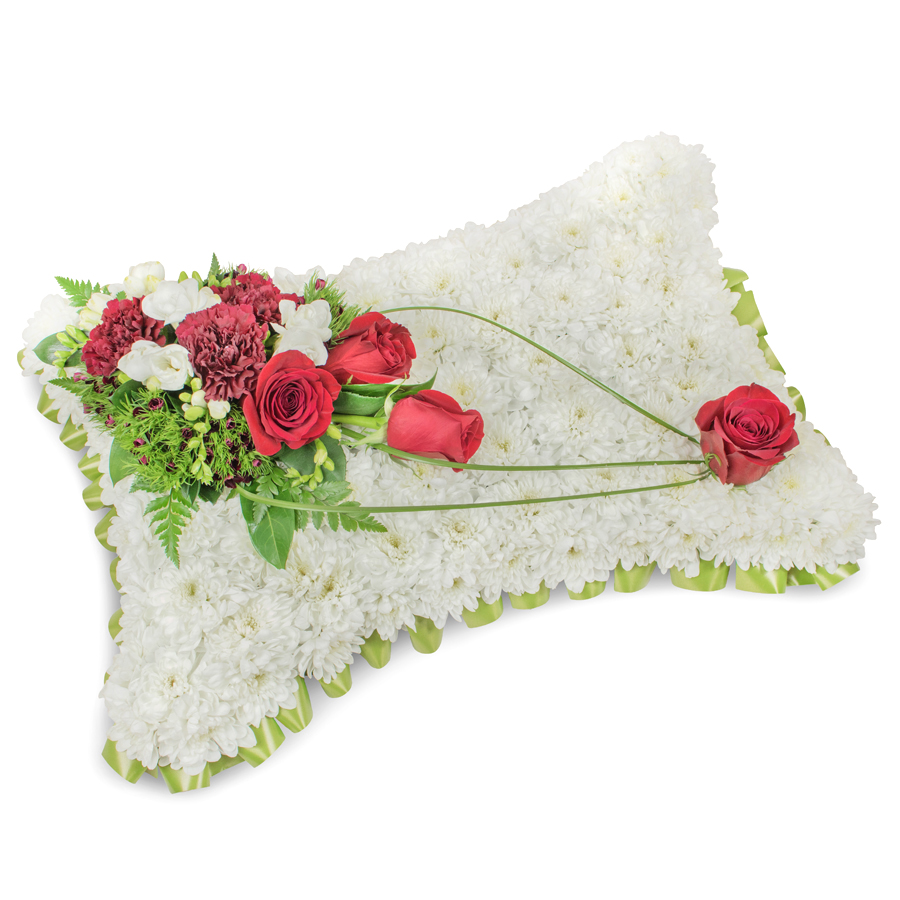 Share your deepest condolences with our Majestic Sympathy Bouquet. Featuring a luxurious mix of white chrysanthemums, red roses, white freesias, dark red carnations, dianthus, and bear grass, this bouquet is designed to convey elegance and heartfelt sympathy.